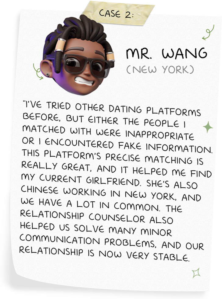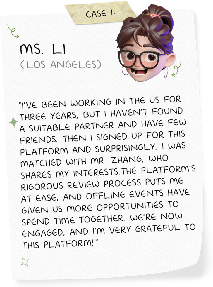 We have a powerful intelligent matching system that can screen out the person who best meets your needs from a large number of high-quality members based on your mate selection criteria (age, education, occupation, interests, values, region, etc.).